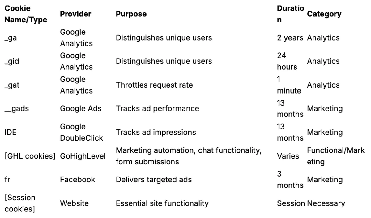 - GoHighLevel: Powers our website functionality, forms, communication, community, and tracks user interactions